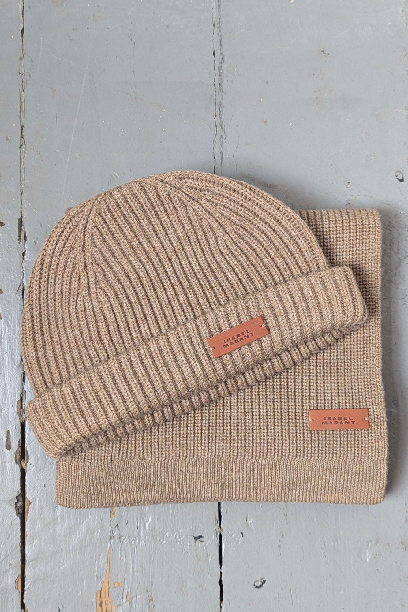 A luxuriously soft scarf, expertly crafted in a superior merino wool featuring a heavy ribbed knit and embossed logo leather patch. Pair with matching Erina taupe beanie hat for the in the perfect a/w set.