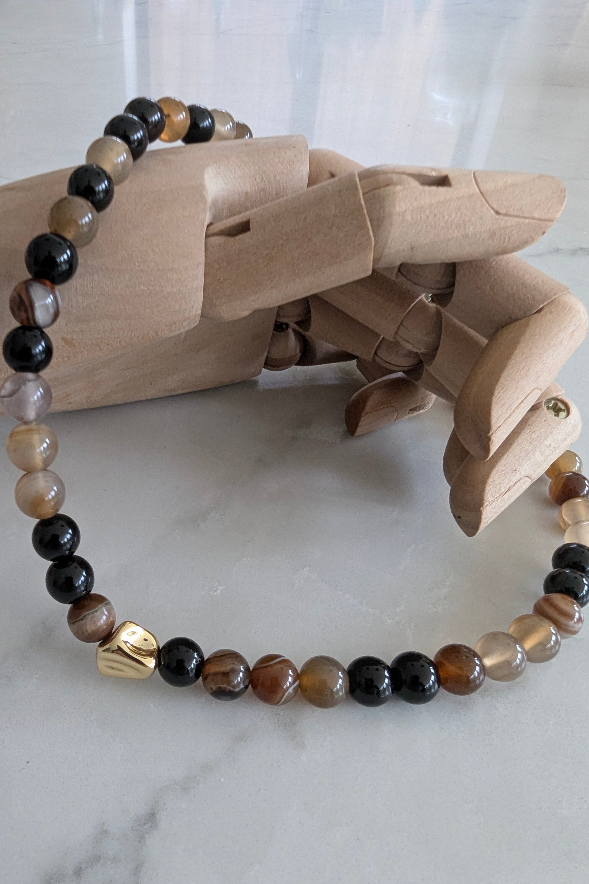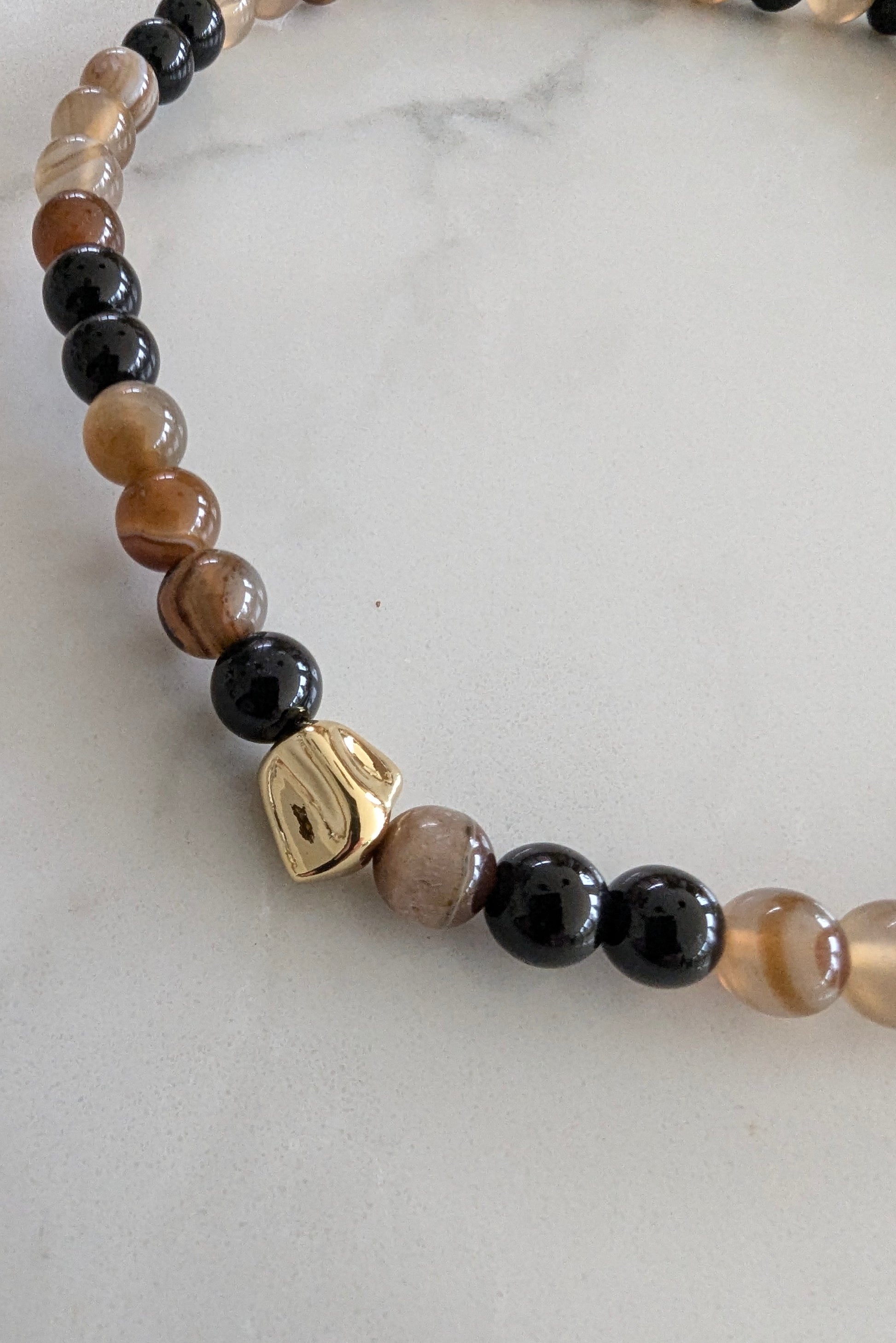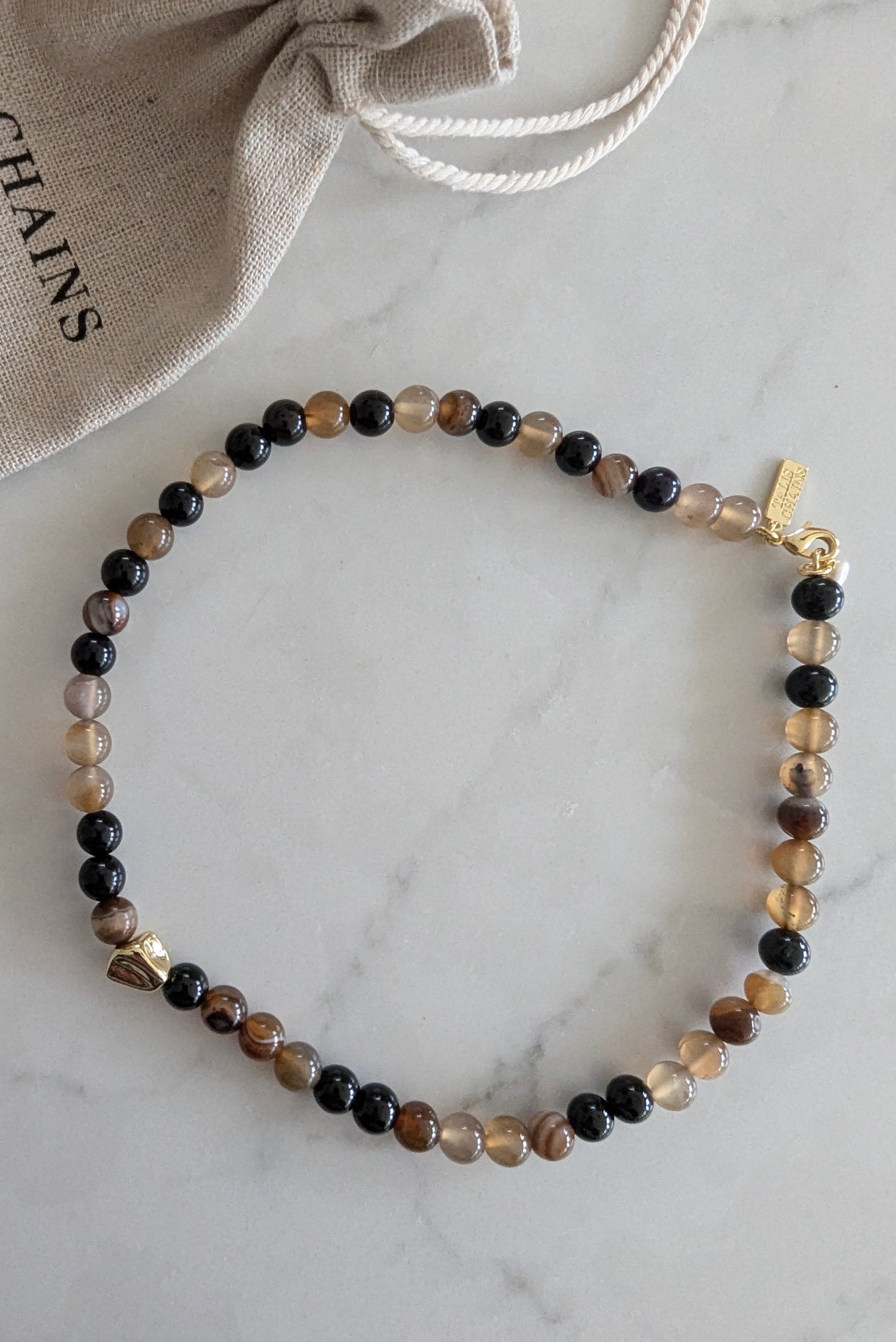 This cat eye bead choker is the perfect coffee hue to layer with your favourite gold chains and the Tiger Eye Pendant Necklace. The front gold nugget adds some lovely texture in juxstaposition to the smooth beads.