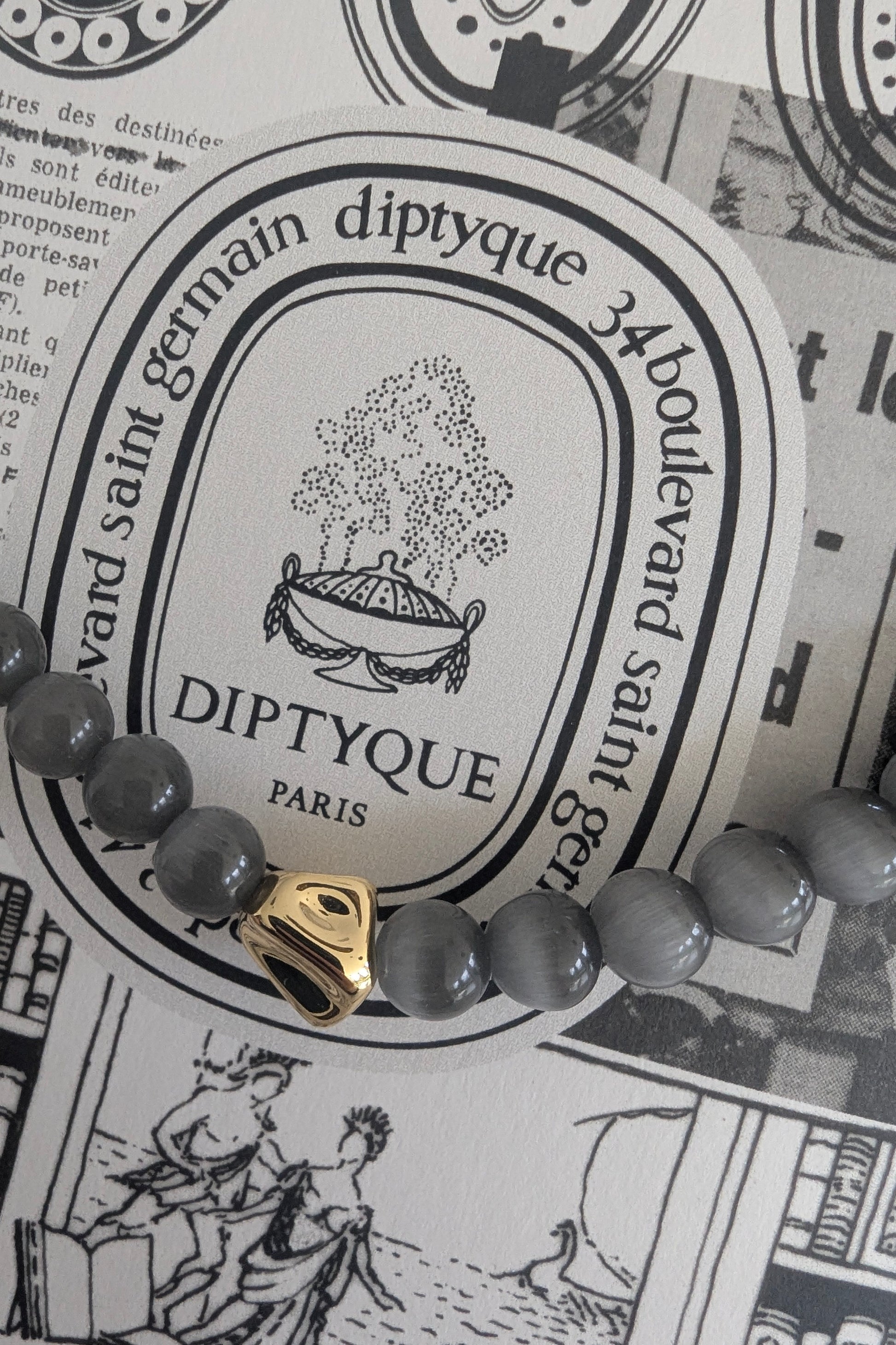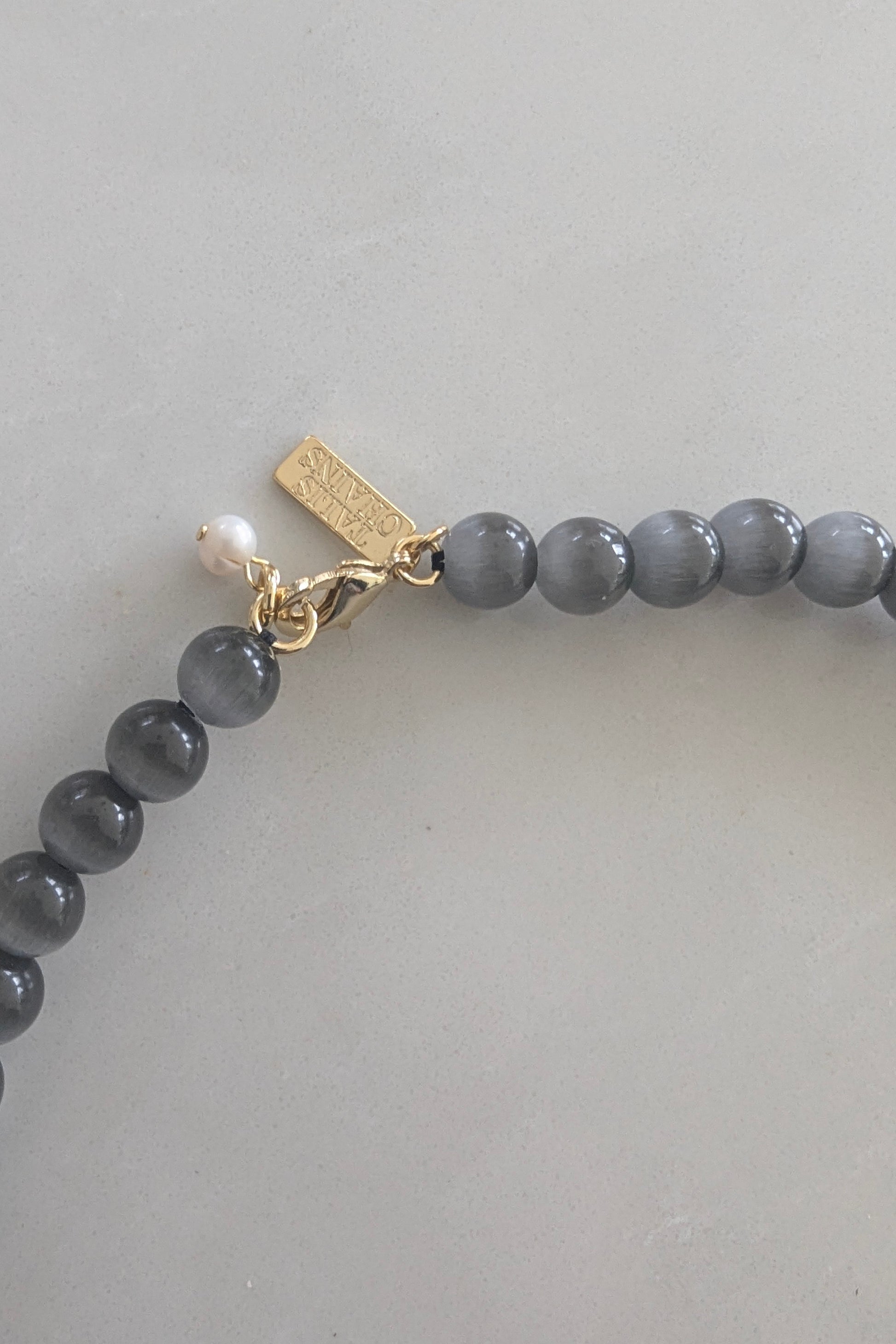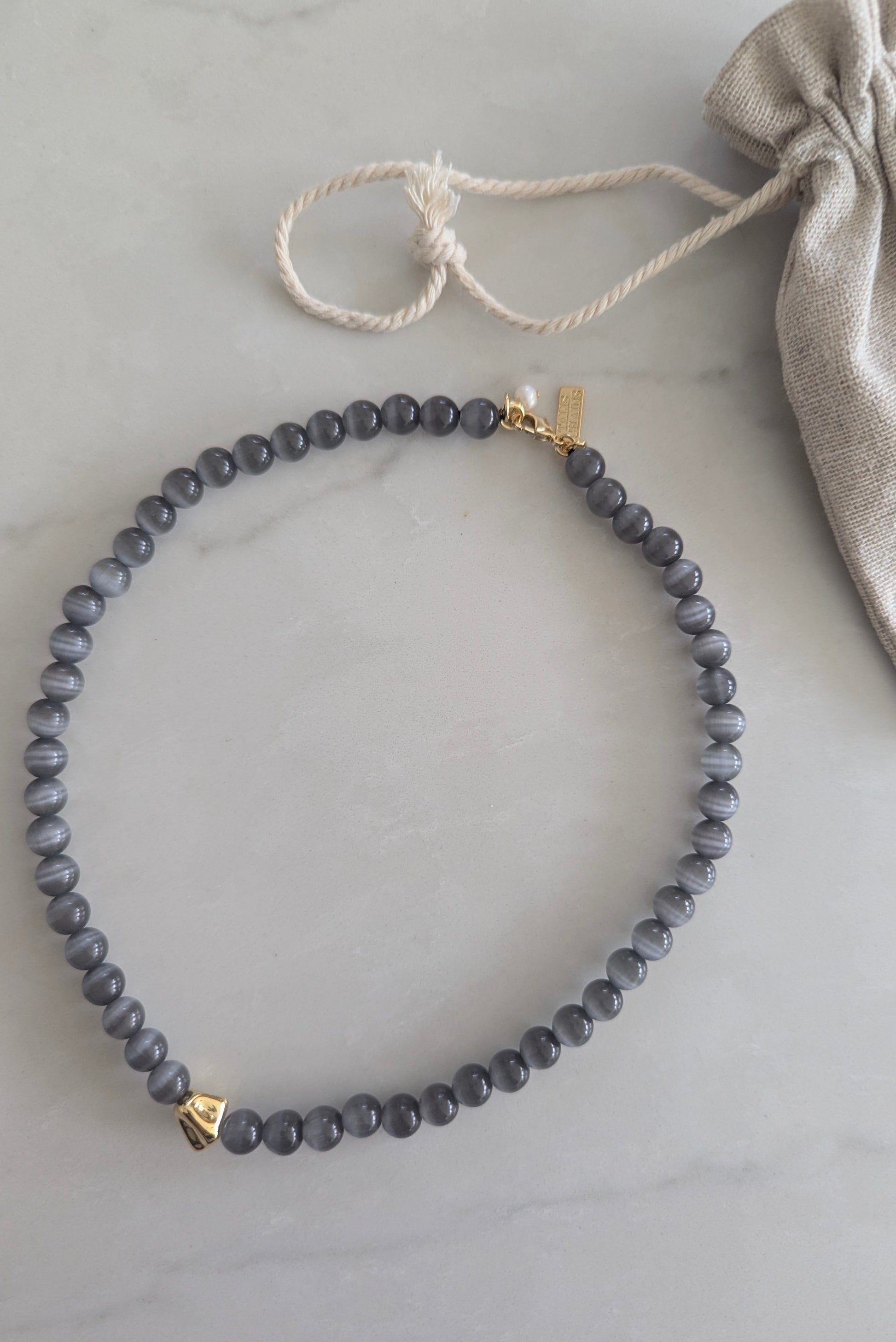 This cat eye bead choker is the perfect grey hue to layer with your favourite gold chains and Grey Eye Pendant Necklace. The front gold nugget adds some lovely texture in juxstaposition to the smooth beads.