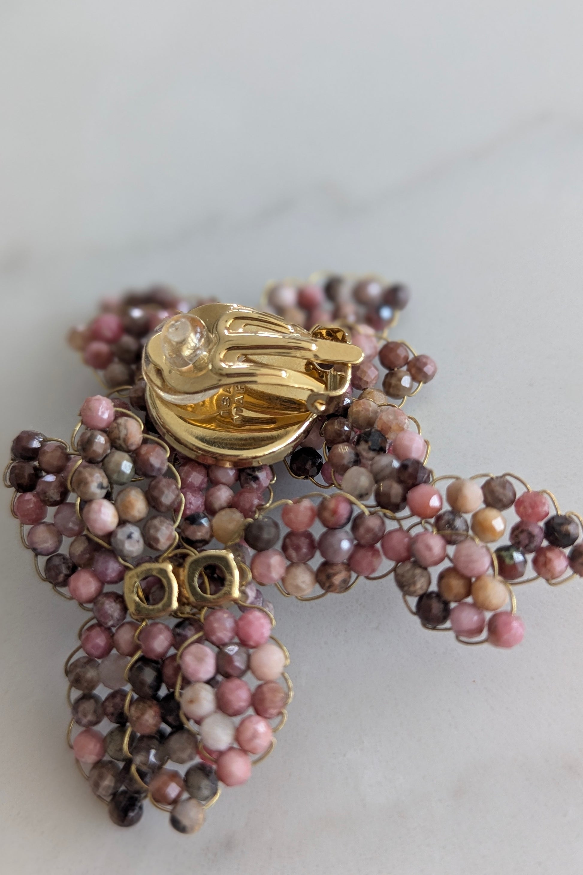 The smaller flower earring is for a pierced ear and the larger cluster flower earring is with a clip. We love the soft pink tones of the natural howlite stone beads,