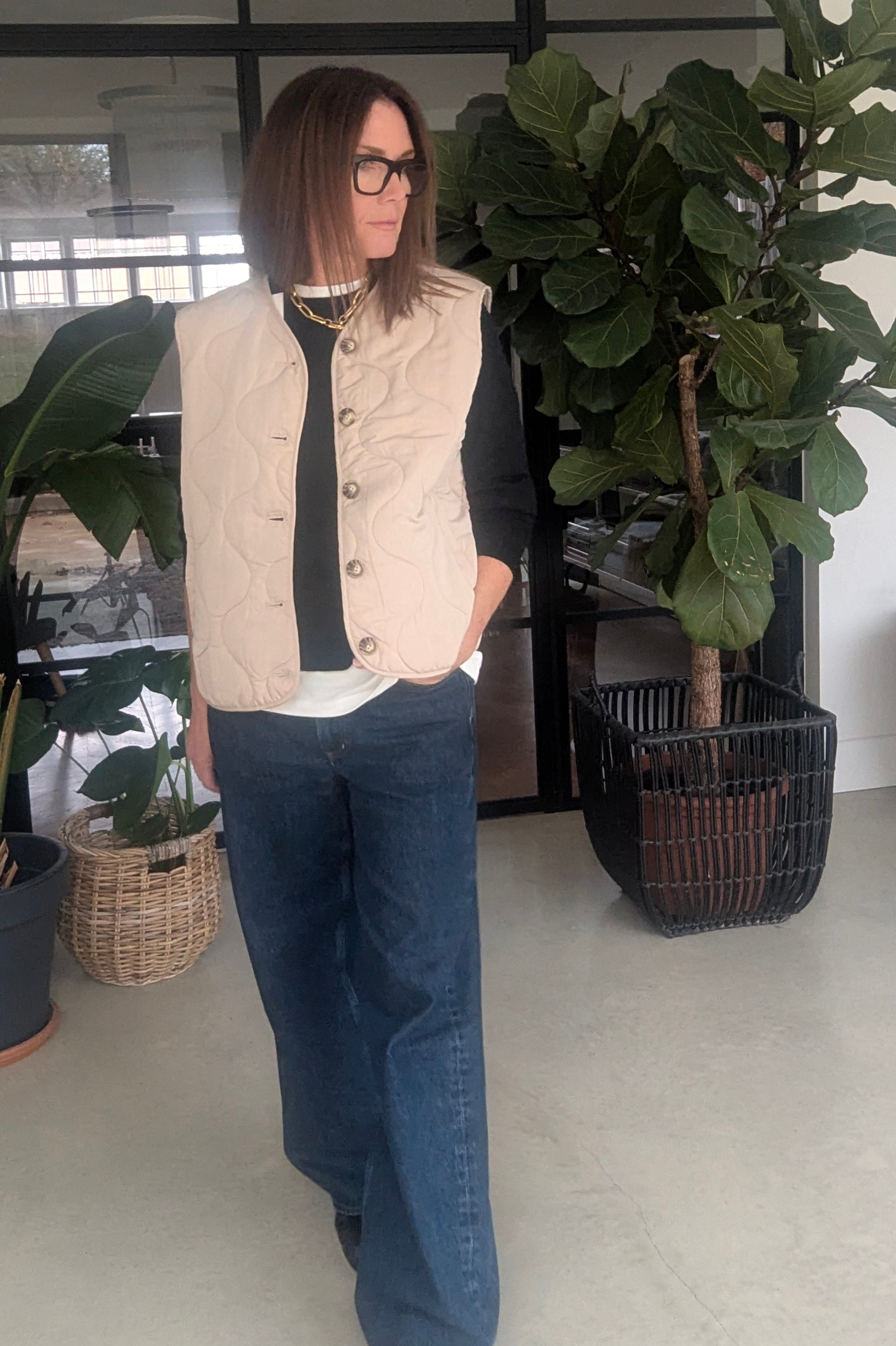 A quilted gilet by our Danish brand Object . In this incredibly wearable colour Humus, it will slot effortlessly into your current wardrobe colour pallette.