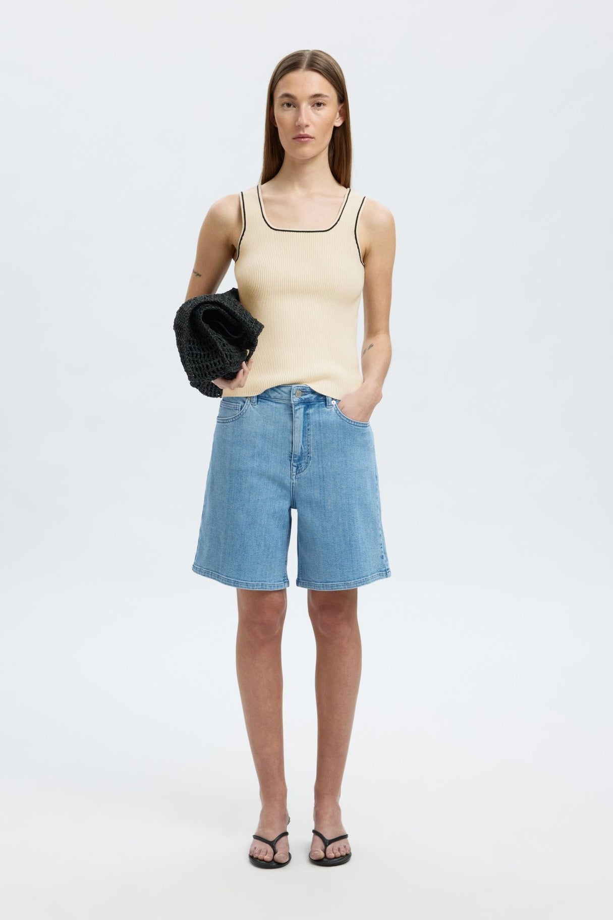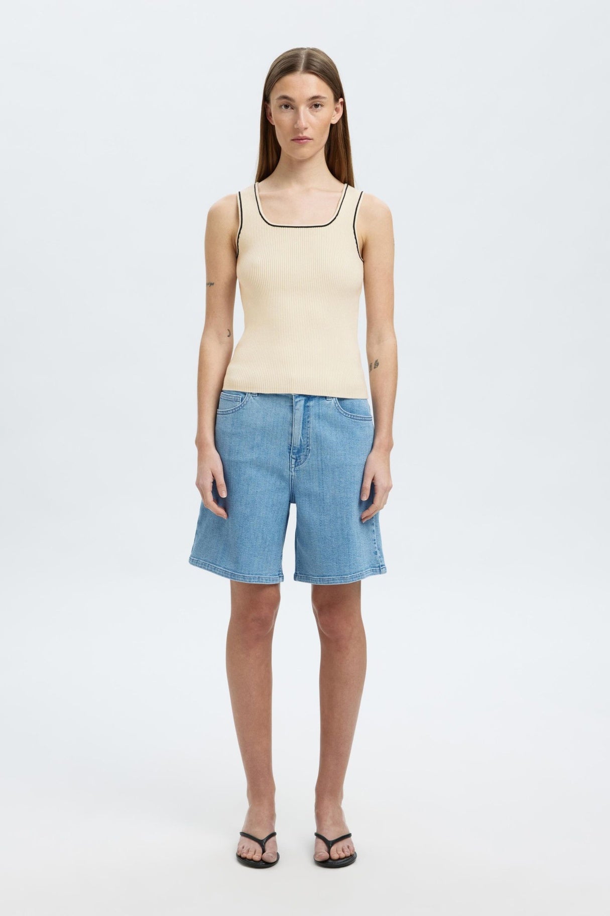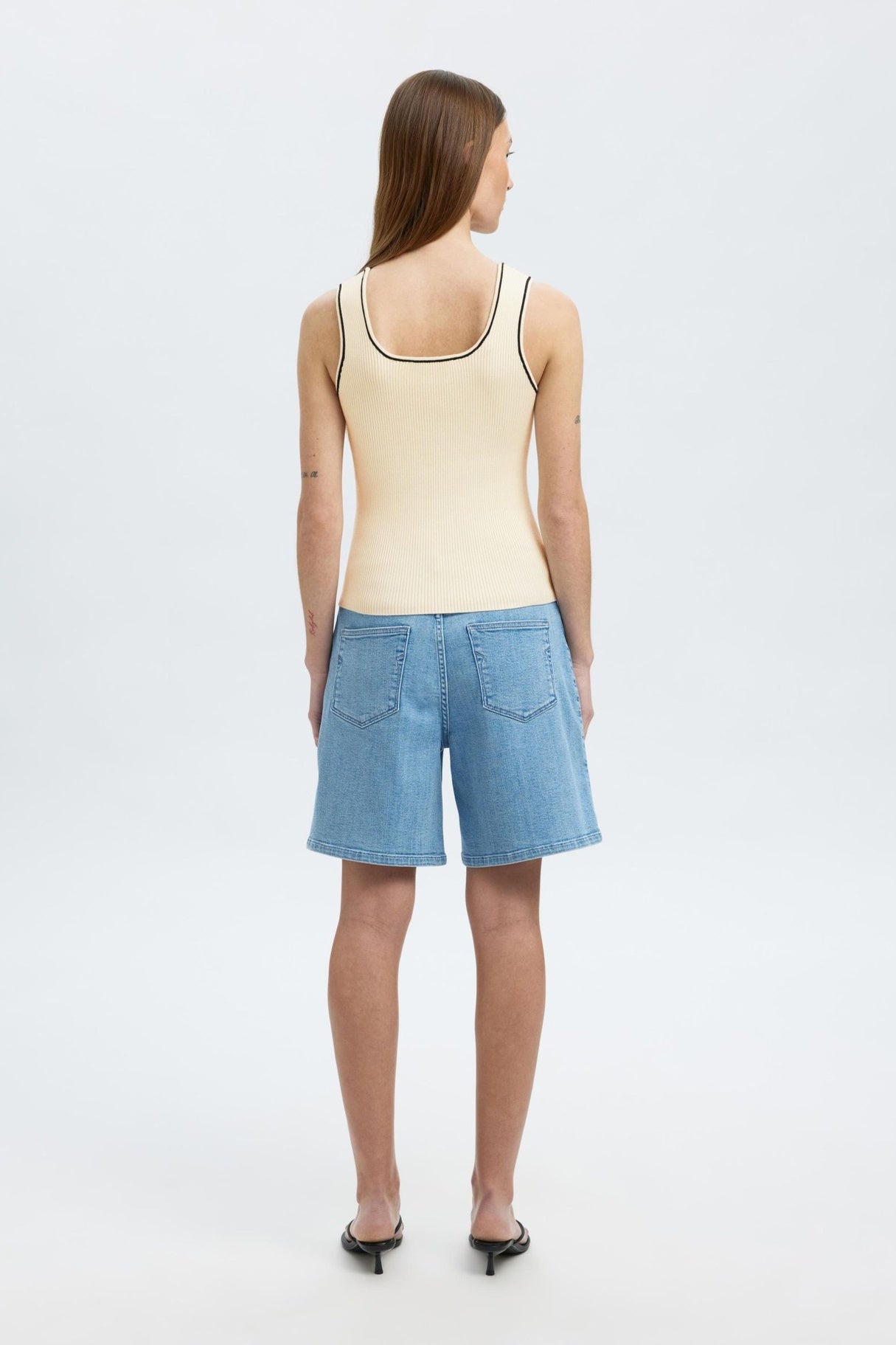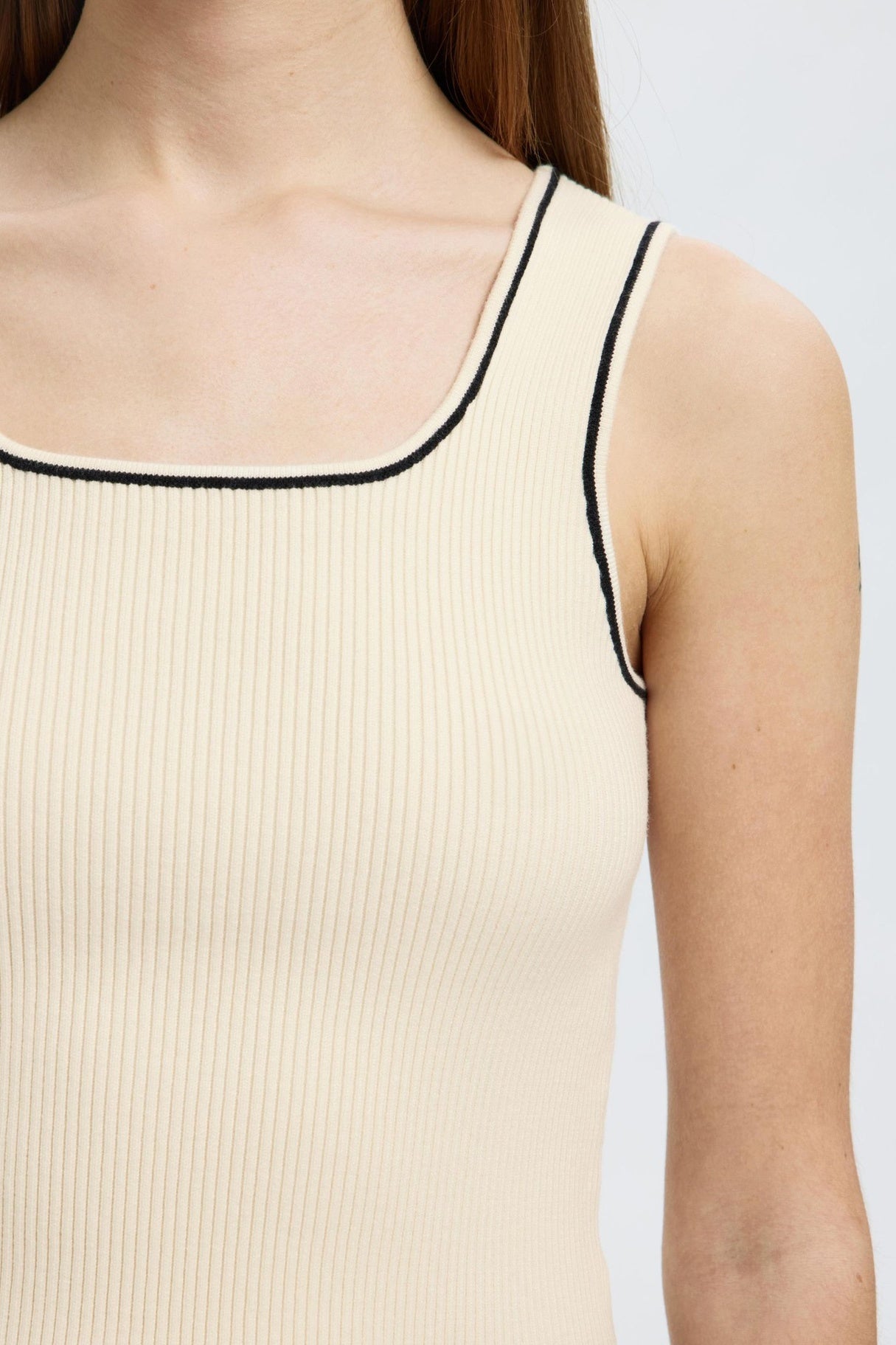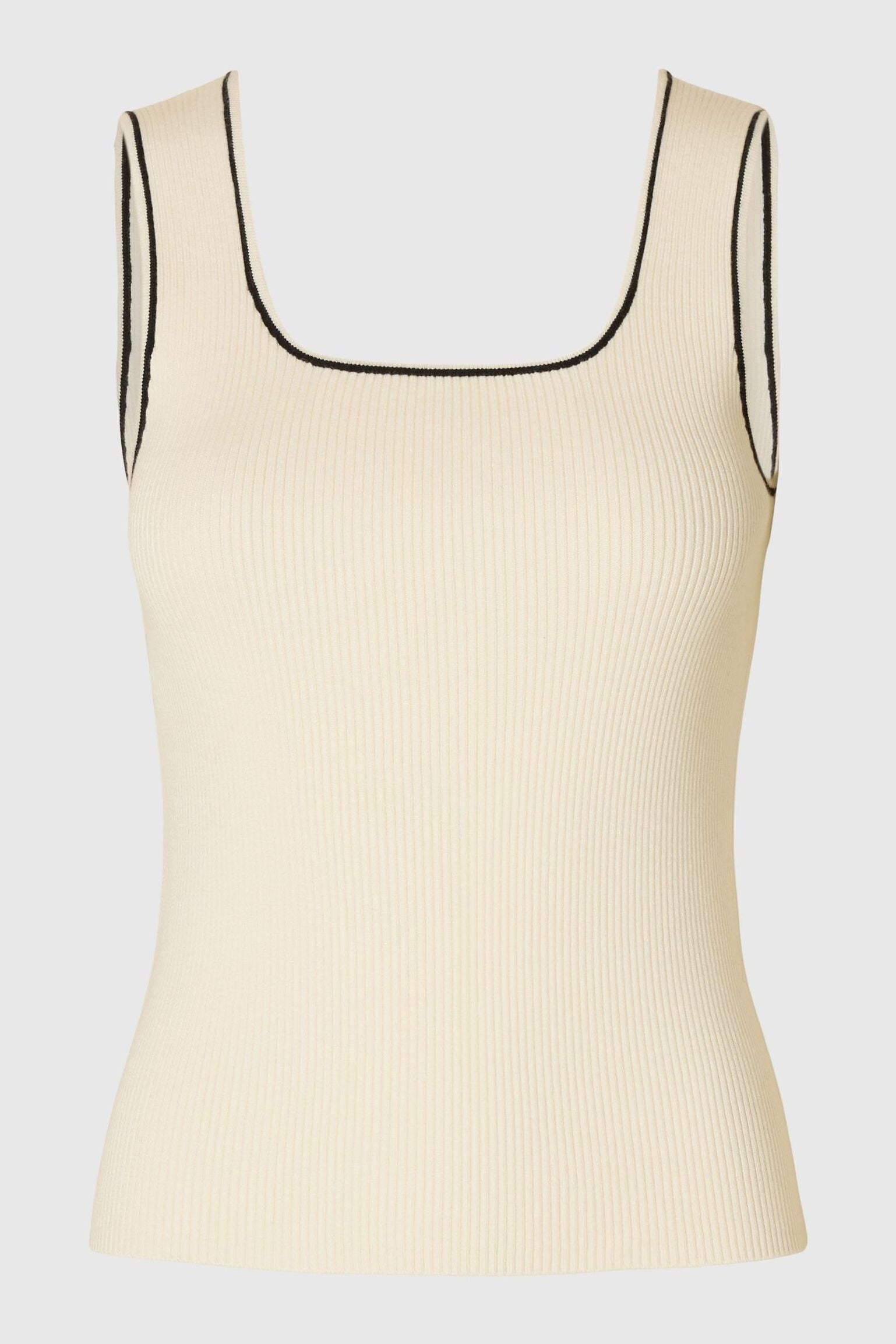 This sleeveless knitted top by Selected Femme is an easy way to add texture to your look. It comes in a ribbed design and features contrast piping at the neckline. Wear it with a pair of tailored barrel-fit trousers and heeled mules.